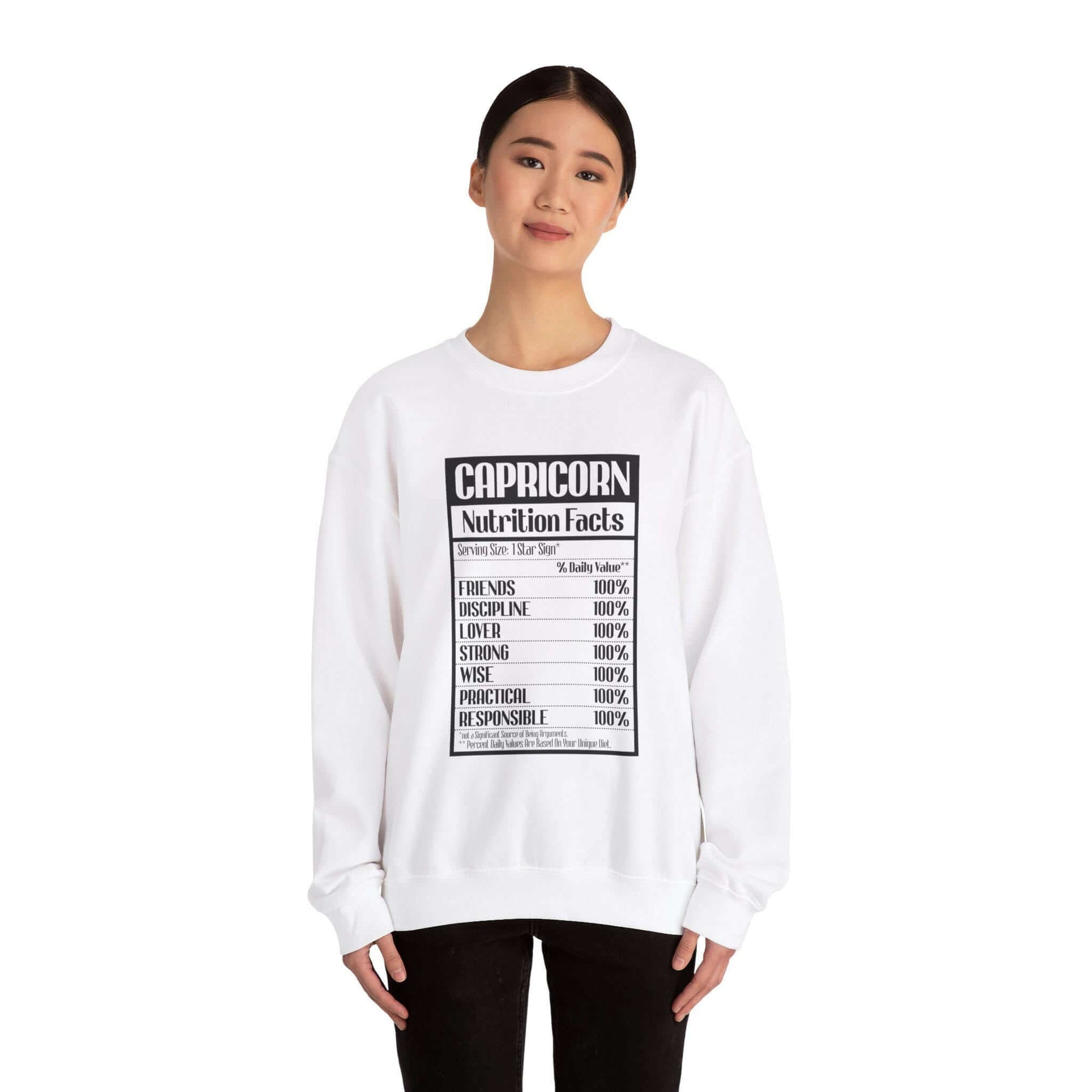 Designed for those who value both comfort and personal expression, the Capricorn Nutrition Sweatshirt stands out as casual zodiac sweatshirt apparel that fits seamlessly into any outfit. The midweight fleece keeps you warm during cooler days while remaining breathable enough for indoor wear. Its clean layout and clear Capricorn theme make it an ideal choice for fans of astrology or anyone seeking a personality printed sweatshirt that sparks conversation.