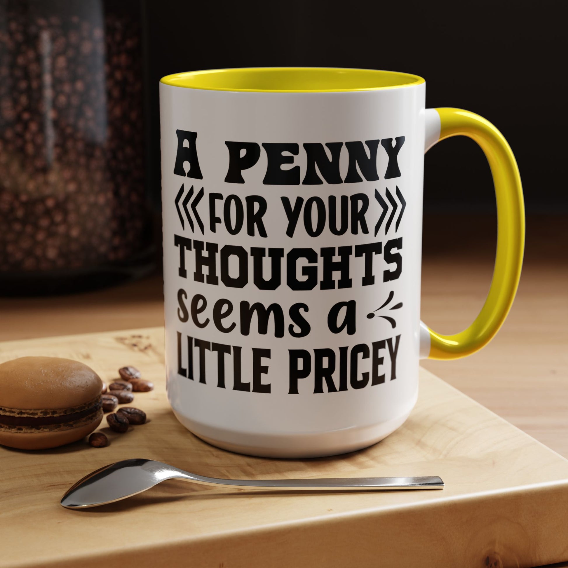 Funny Coffee Mug, Personalized Mug, A Penny For Your Thoughts Seems Pricey Accent Coffee Cup (11, 15oz), Gift Under 20, White Elephant
