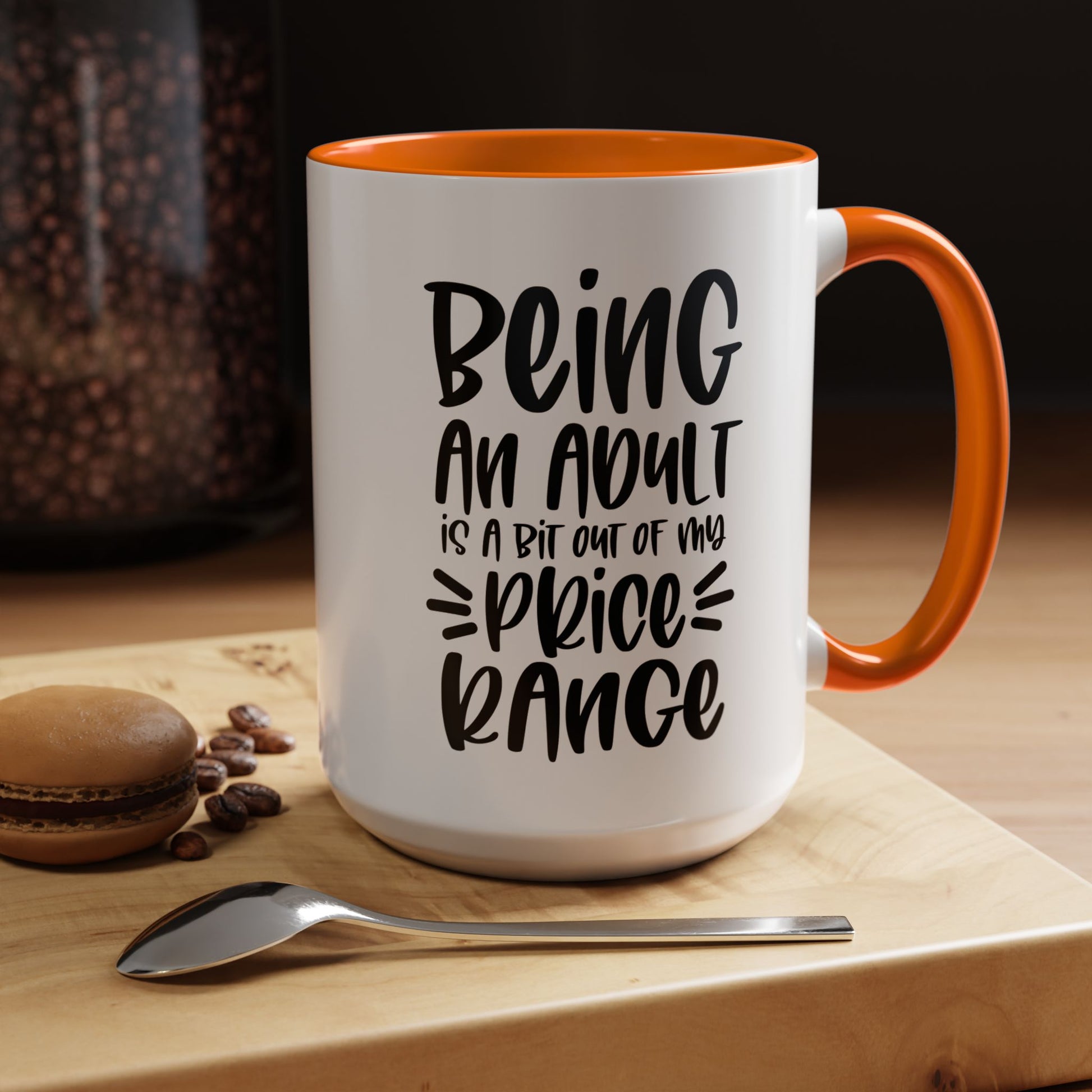 Funny Coffee Mug, Personalized Mug, Being An Adult Is bit Out Of My Price Range Accent Coffee Cup (11, 15oz), Gift Under 20, White Elephant