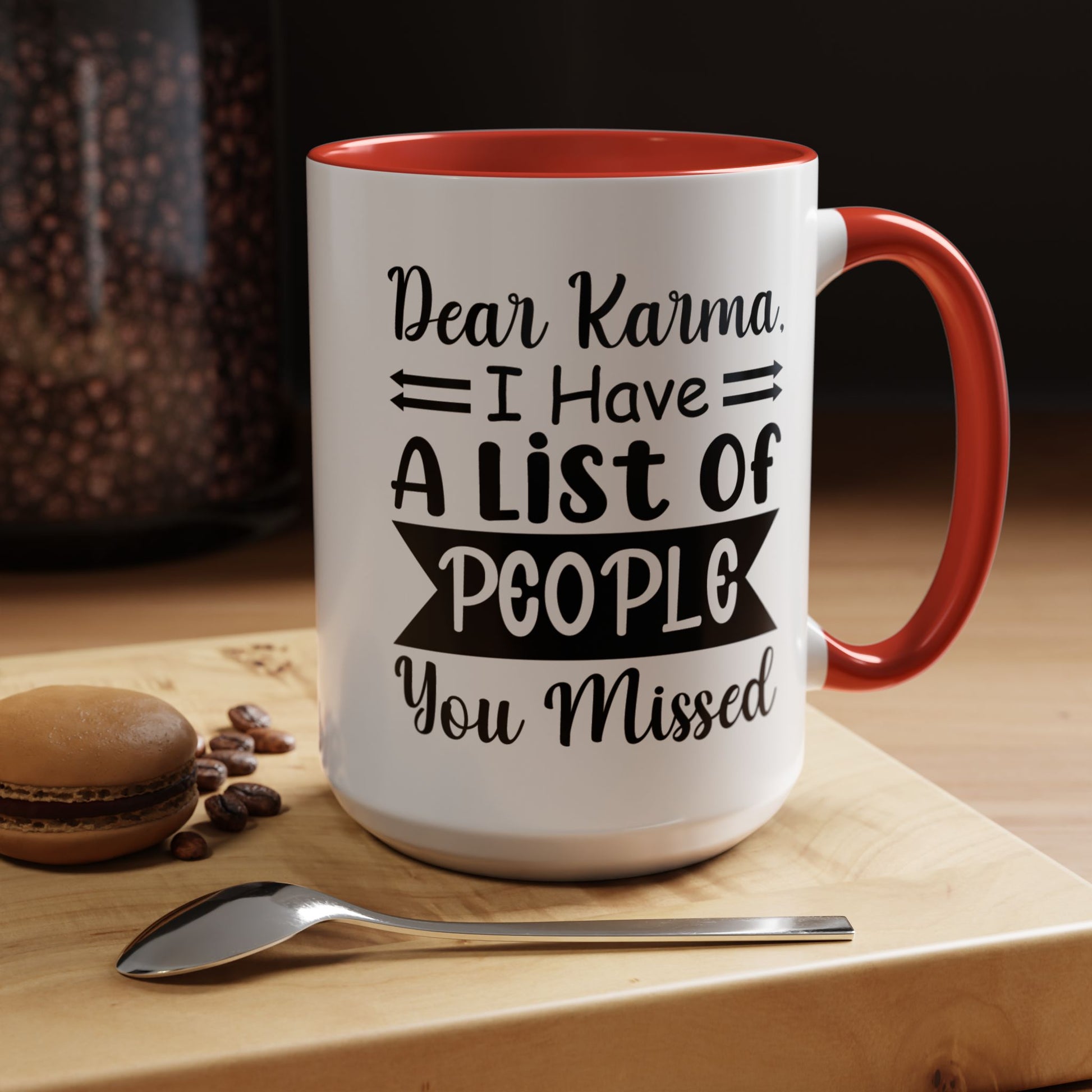 Funny Coffee Mug, Personalized Mug, Dear Karma I have a list of people you missed Accent Cup (11, 15oz), Gift Under 20, White Elephant gift