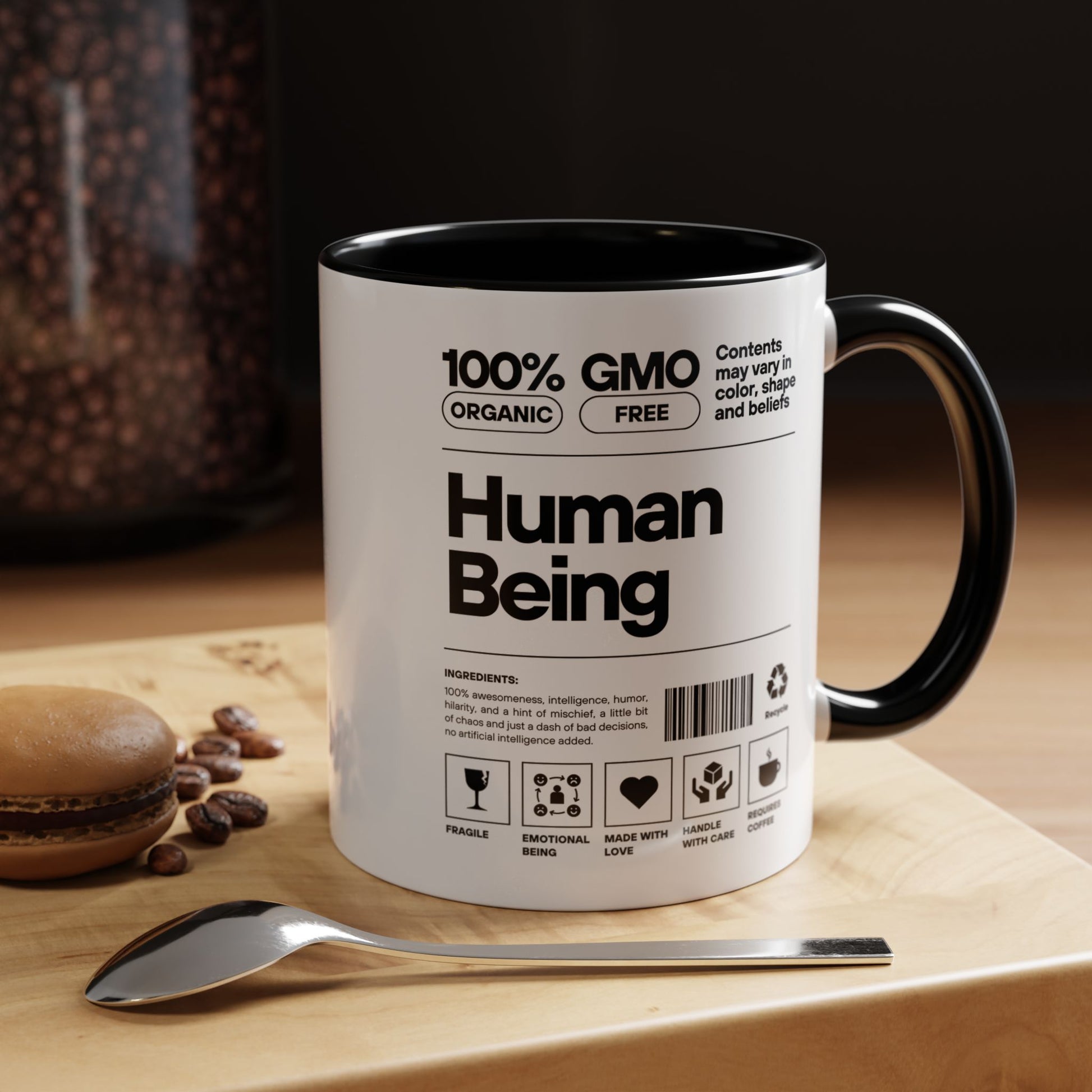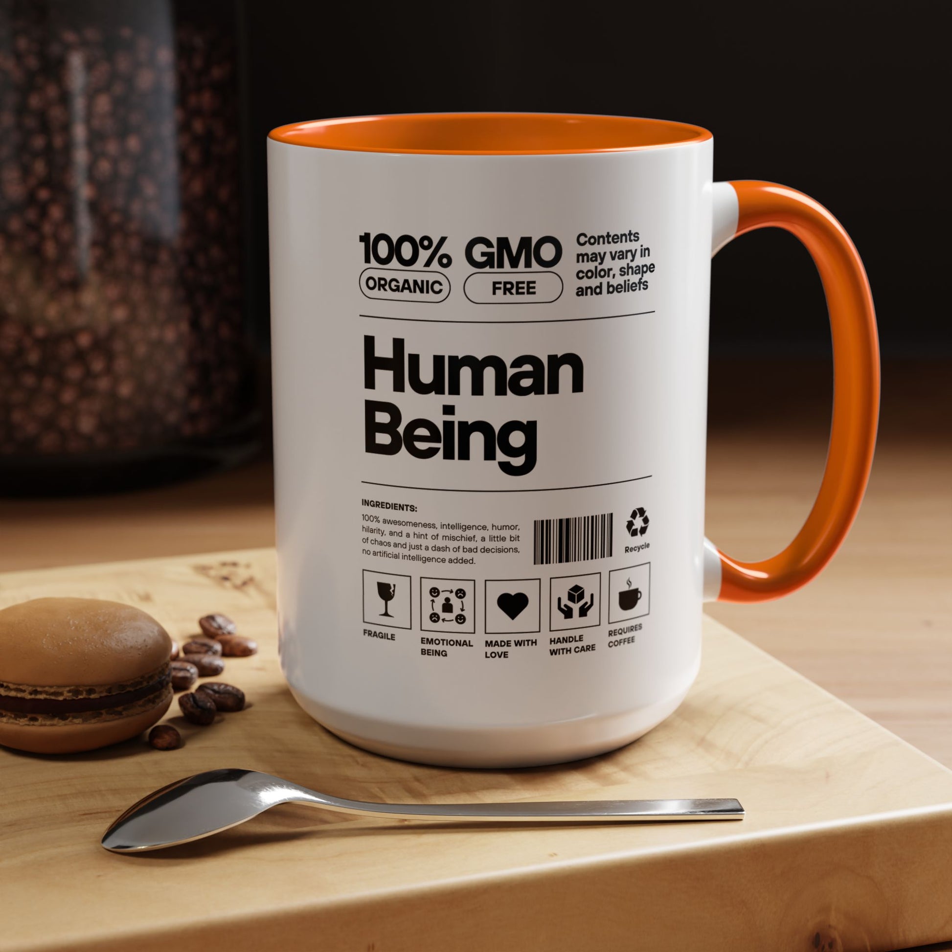 Funny Coffee Mug, Personalized Mug, Human Being Nutrition Facts Accent Cup (11, 15oz), Gift Under 20, White Elephant gift