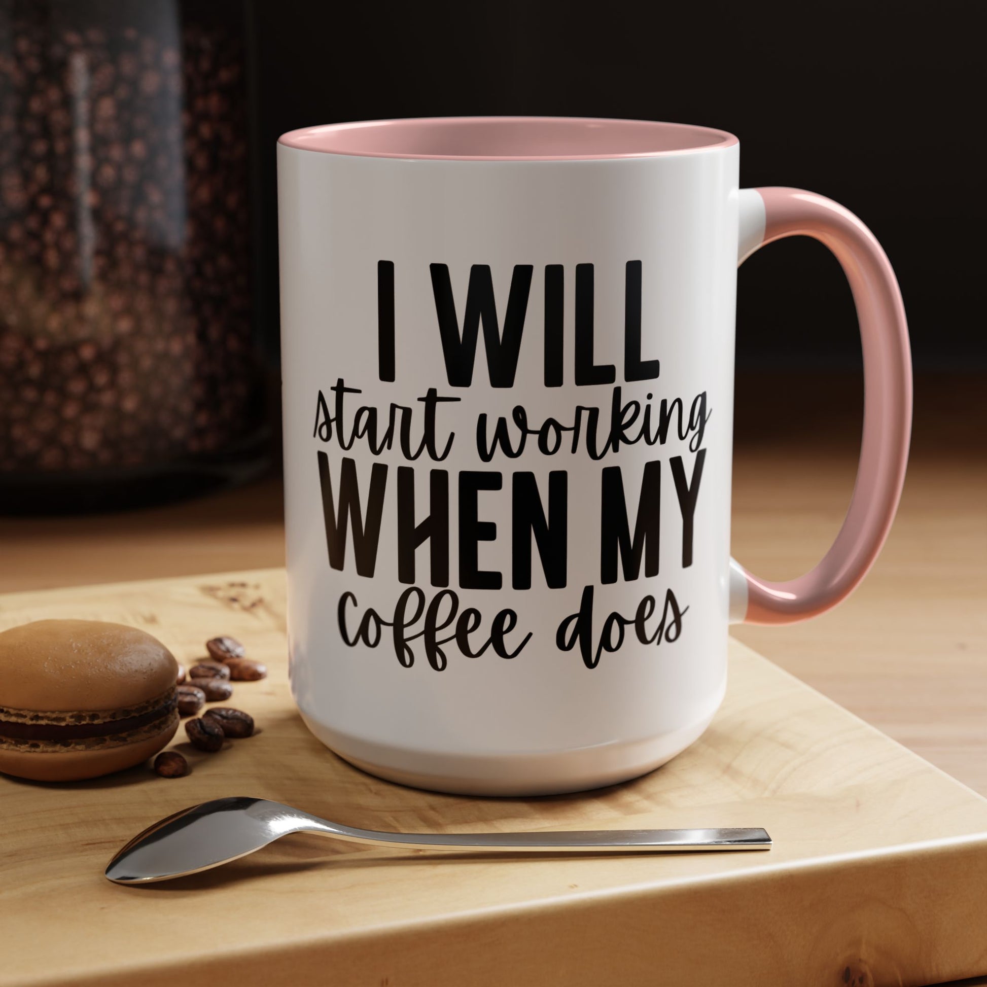 Funny Coffee Mug, Personalized Mug, I Will Start Working When My Coffee Does Accent Cup (11, 15oz), Gift Under 20, White Elephant