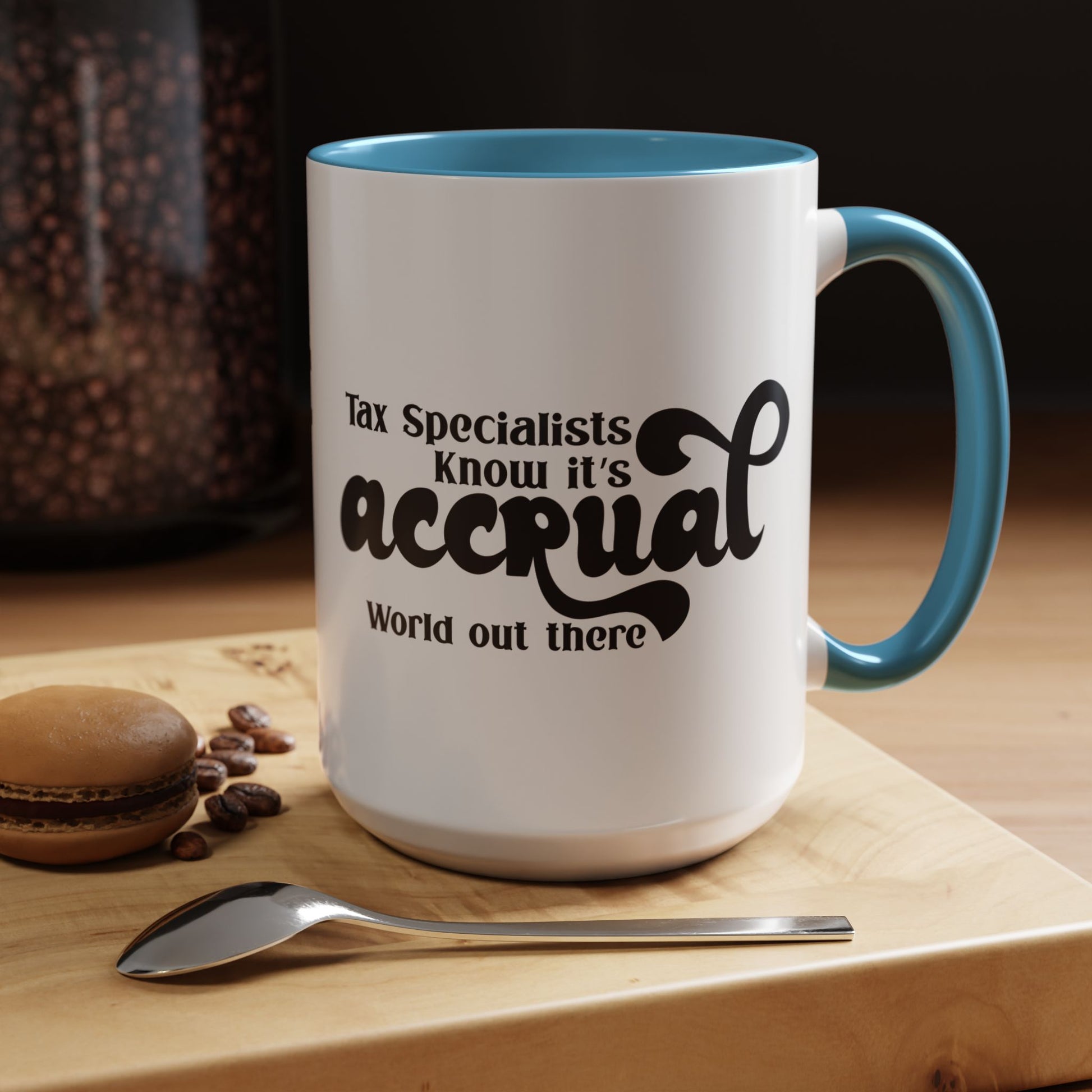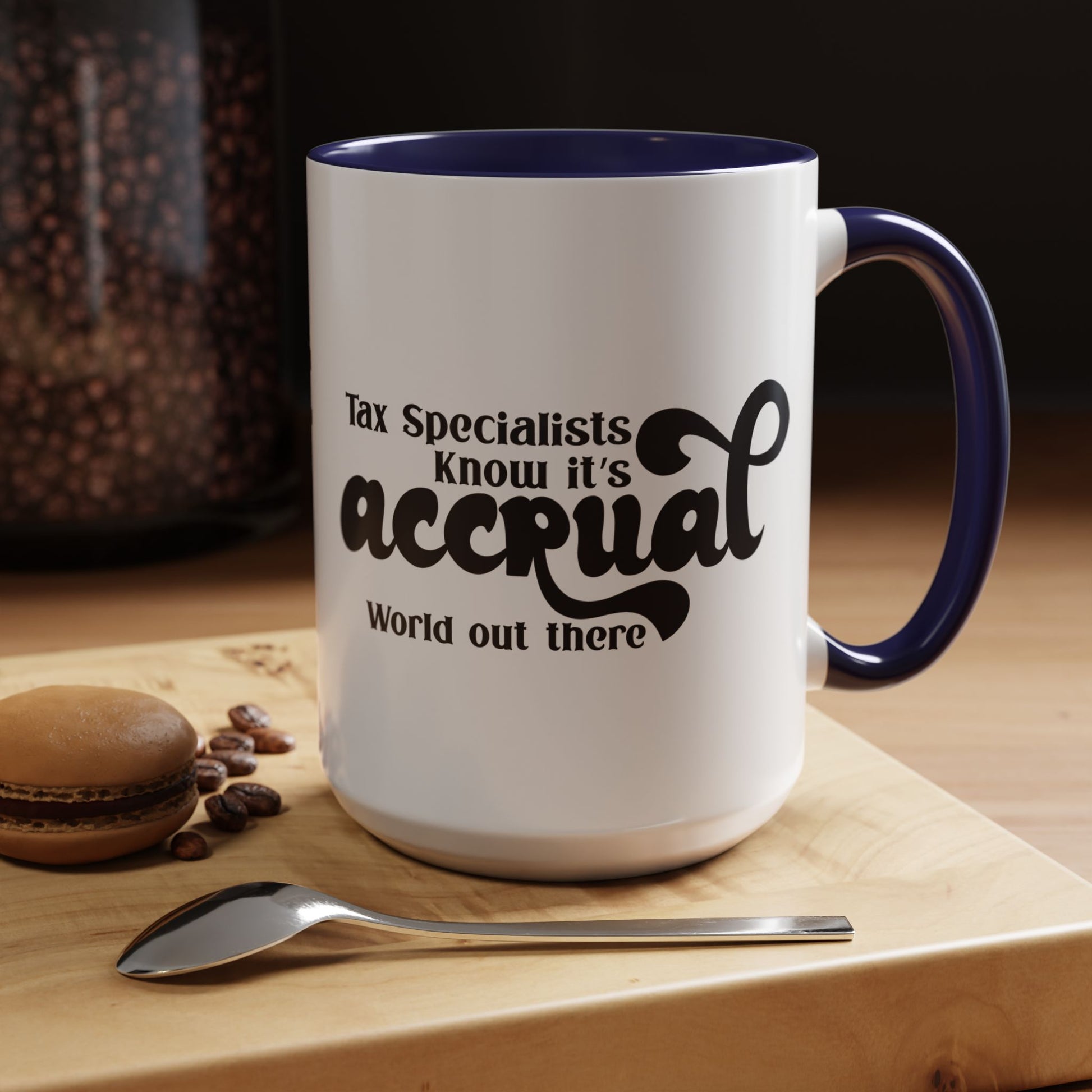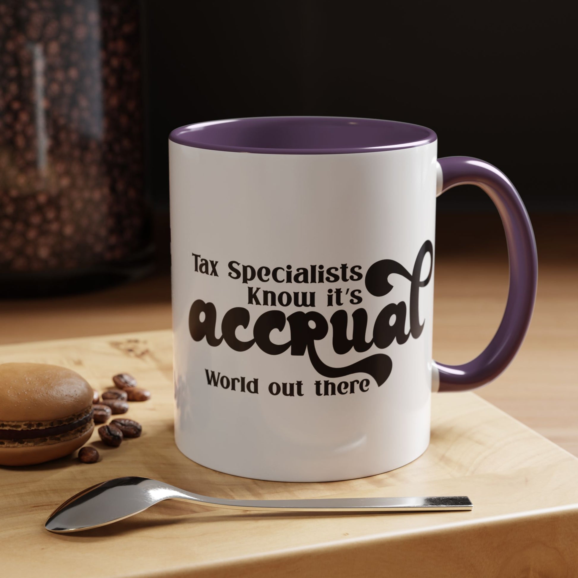 Funny Coffee Mug, Personalized Mug, Tax Specialist Knows It's Accrual World Out There Accent Cup (11, 15oz), Gift Under 20, White Elephant