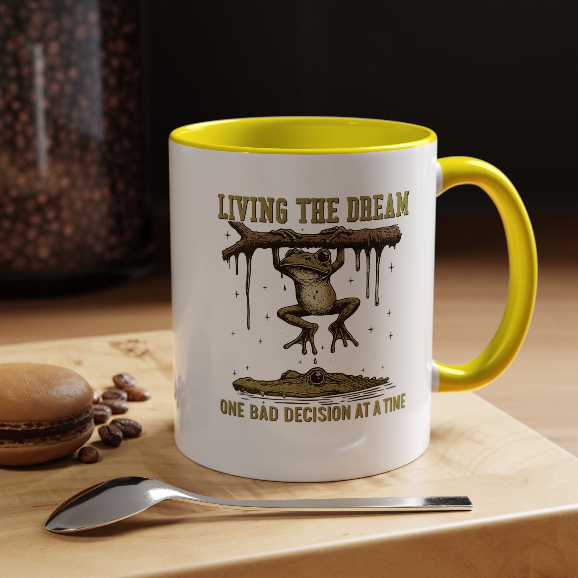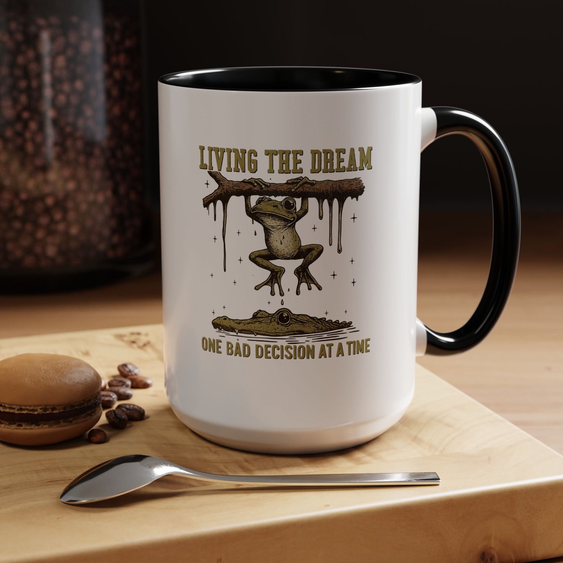This Living The Dream One Bad Decision mug is perfect for coffee, tea, or cocoa. A funny, sarcastic, and unique design that makes a great gift for friends, coworkers, or family. High-quality ceramic with dishwasher and microwave safe print.