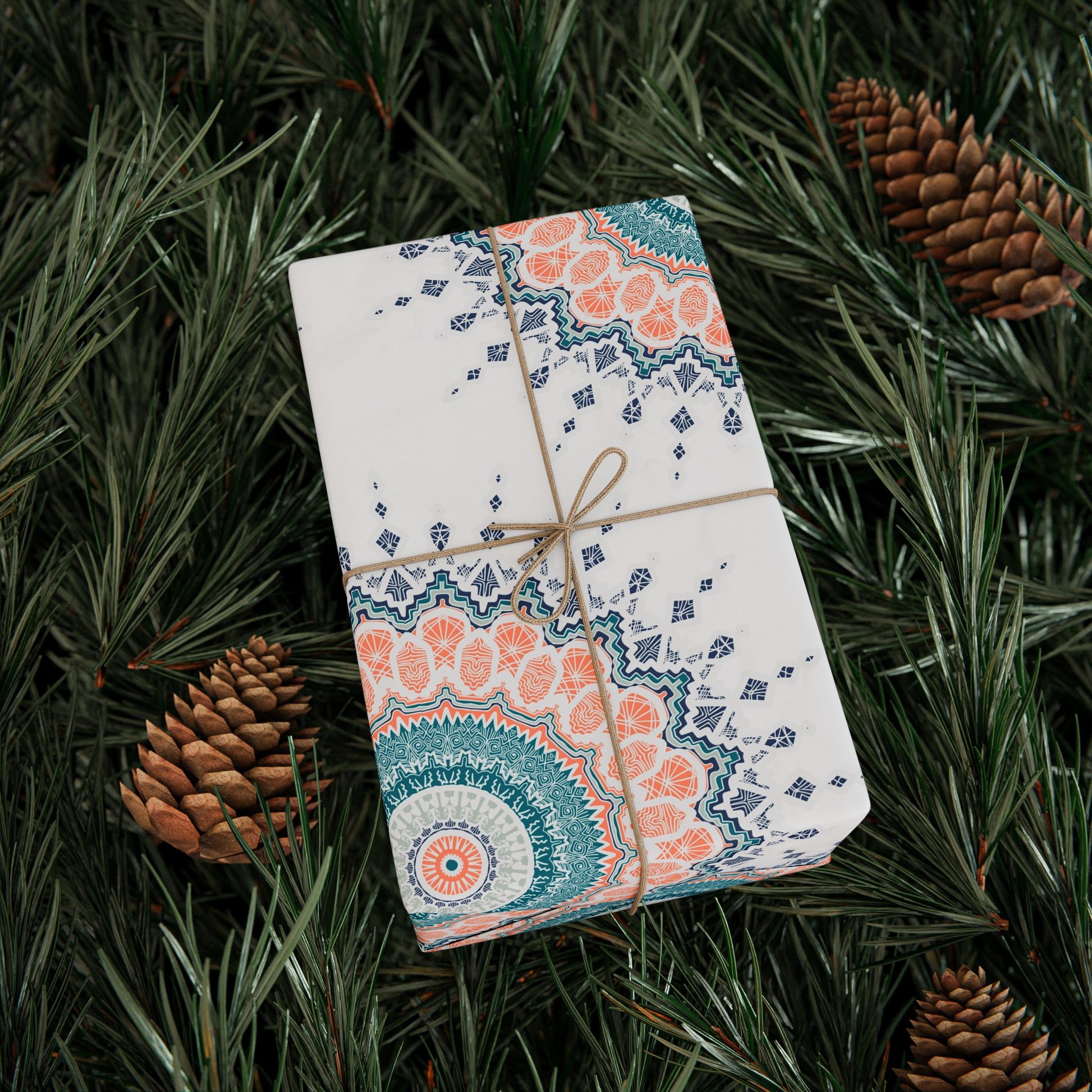 Deep navy wrapping paper is patterned with hand-drawn moons, stars, dreamy florals, and Mosque illustrations. The repeat design feels like a pocket of night sky—gentle, whimsical, and a little mysterious. Unfurl a long sheet and you’ll find a comforting rhythm: warm golds and soft coral accents that lift the dark background. It dresses up gifts for friends who love cozy nights, stargazing, and maker-made traditions.
