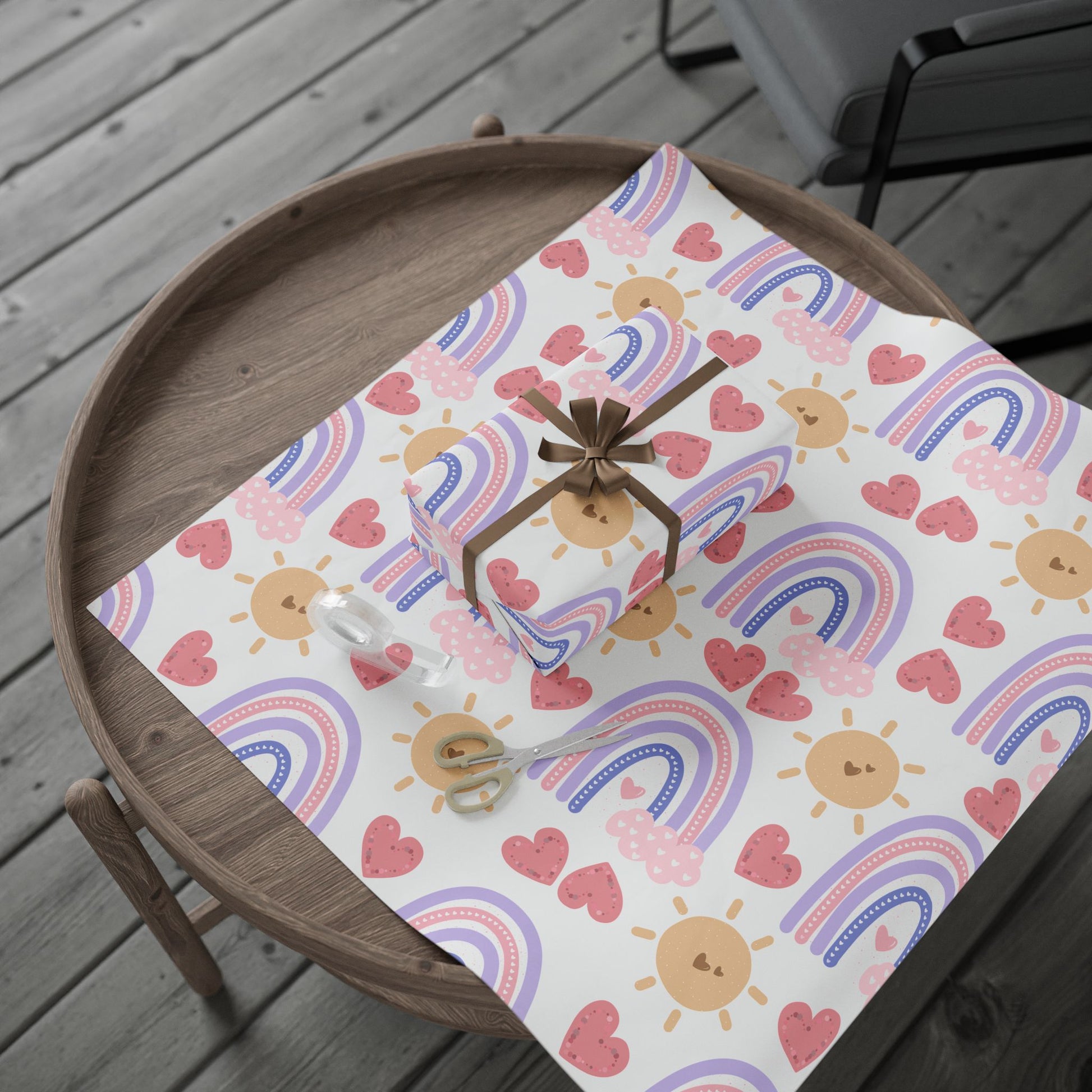 This roll of illustrated wrapping paper brings a soft, whimsical touch to gift-giving. Delicate sun motifs, flowing pastel waves, and playful hearts repeat across a clean white background, creating a light, joyful pattern that feels homemade and thoughtful. The 90gsm fine art paper holds crisp high-definition prints and folds neatly around boxes and bottles while still feeling substantial. Choose a glossy finish for a bright, lively sheen or a smooth matte for a gentle, hand-crafted look. Available in three lengths to suit small trinkets or long-format gifts like champagne bottles and posters. Small production marks (white edge with barcode/QR) appear along the roll ends as part of the print process.